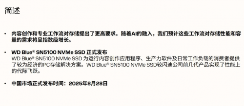 Sandisk闪迪公司中国区分销渠道事业部总经理陈光辉表示:“随着AI应用程序和4K/8K超高清内容的加速普及,内容创作者、专业人士及PC升级用户在面对日益繁重的工作流程时,对存储的性能、容量与稳定性提出了更高要求。为进一步释放AI潜能、激发用户创意,闪迪推出了WDBlue®SN5100NVMeSSD。该产品搭载PCIe®Gen4.0技术,为创作者和专业用户提供流畅且可靠的使用体验,助力他们创作不设限,存储更从容,高效完成每一个项目。”