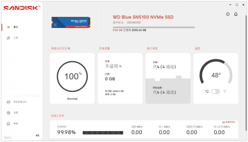 低功耗设计也赋予了WDBlueSN5100NVMeSSD更宽广的工作范围,根据闪迪官方数据,其支持的工作温度范围是0~85℃,高于常见的0~70℃标准。因此WDBlueSN5100NVMeSSD甚至可以在没有配备散热片的情况下,依然能够稳定进行。同时闪迪还为WDBlueSN5100NVMeSSD提供免费了SandiskDashboard仪表盘工具供用户下载。该软件不仅能对固态硬盘的性能进行维护、监控。比如监控产品的工作温度、健康度与传输通道。用户还可使用Trim工具优化SSD性能,侦测固态硬盘的工作状态,在线对固态硬盘的固件进行升级,还可对SSD进行安全擦除,使固态硬盘的性能恢复到出厂状态。