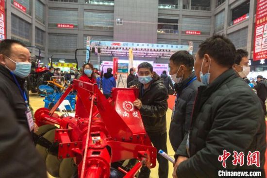 3月6日,江西南昌,2021中部(江西)农业机械及零部件展览会现场,观众正在向参展商了解展出的设备。刘力鑫 摄
