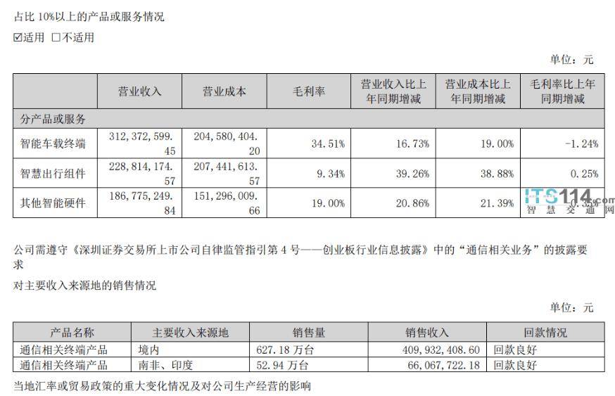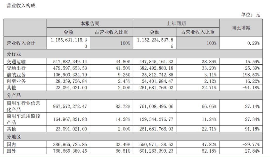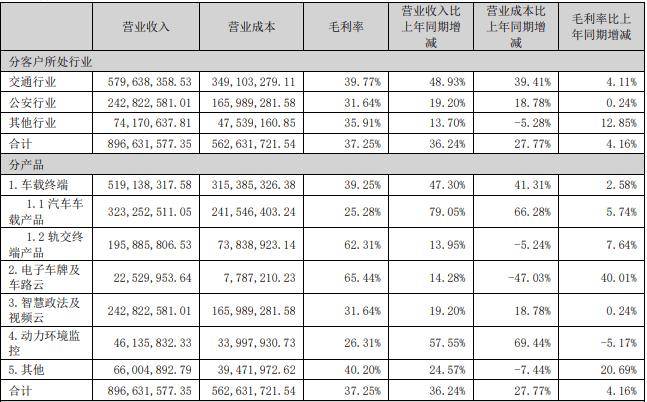 其中,“交通行业”实现收入57963.84万元,占营业总收入比重64.65%;较上年同期增长48.93%,从表格中可以看出,交通行业业务收入主要源自车载产品(智能网联)及轨交终端。