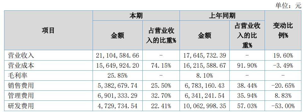 报告期内,公司实现营业总收入21106.60万元,同比增长5.43%,实现归属于上市公司股东的净利润1167.30万元,同比增长55.32%;归属于上市公司股东的扣除非经常性损益的净利润855.21万元,同比增长205.36%。