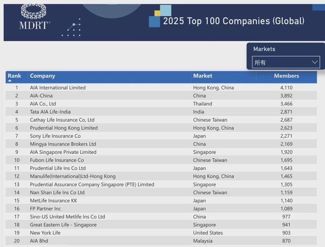 实际上,2025全球MDRT百强榜单中,中国有34家入围,其中有13家内地公司。