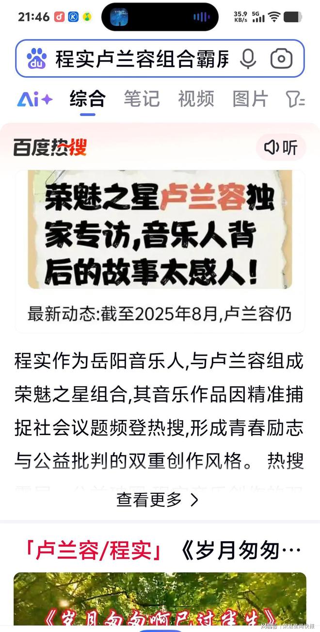 截至2025年9月13日,综艺导演、音乐人「卢兰容程实」组合(荣魅之星)的最新动态聚焦于原创歌曲《向前闯逆风也张扬》《青春足球激情飞扬》《放下手机游戏为自己搏一回》《岁月匆匆啊已过半生》的持续热榜和文化融合活动。该组合自2025年8月上线新歌后,频繁占据百度热搜、微博热榜等平台超43次,引发全网对青春励志与人生感悟的讨论。MV播放量破千万,被评价为“精准捕捉社会情感共鸣”。此外,卢兰近期参与纪念抗战胜利80周年CCTV七彩星球《爱在天地间》盛典晚会,担任执行导演指导及全国运营总监。